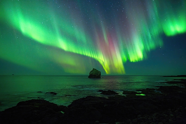 Aurora over the sea near the Reykjanes peninsula of Iceland. In the imagination, one can see the tail of a whale made of light as it dives beneath the waves.