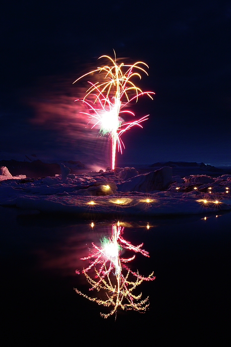 Fireworks display at the Jökulsárlón glacial lagoon in southeastern Iceland.